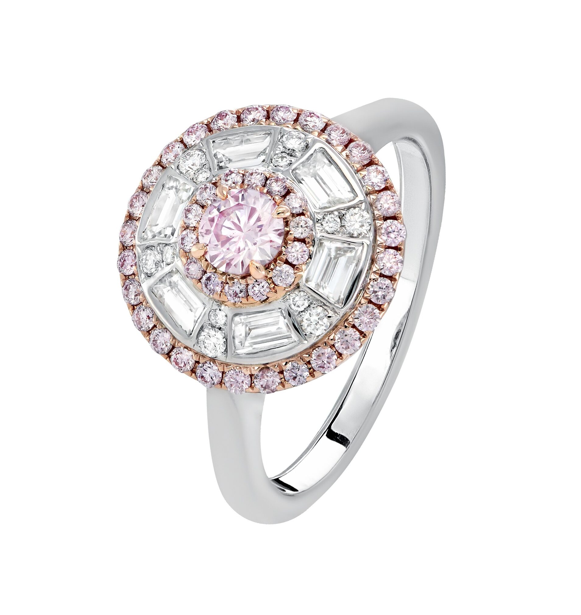 18ct White and Rose Gold Ring set with a magnificent 1 = 0.22ct 7P/P1 Round Brilliant Cut, Argyle Certified Australian Pink Argyle Diamond accented beautifully by 42 = 0.28ct Fancy Light Pink Australian Pink Argyle Diamonds and 6 = 0.65ct F/VS Trapezoid Cut Diamonds!