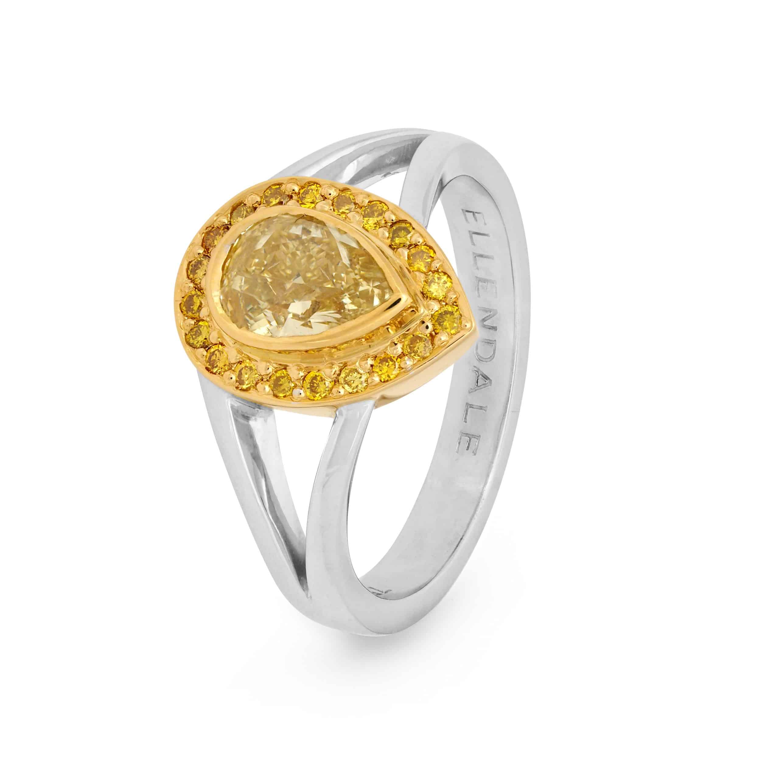 This ring in 18ct White & Yellow Gold is set with 1 x Pear Cut 1.01ct FY/VS Fancy Intense Yellow Diamond accented by 20 = 0.16ct RBC Fancy Vivid Yellow SI Dimaonds.