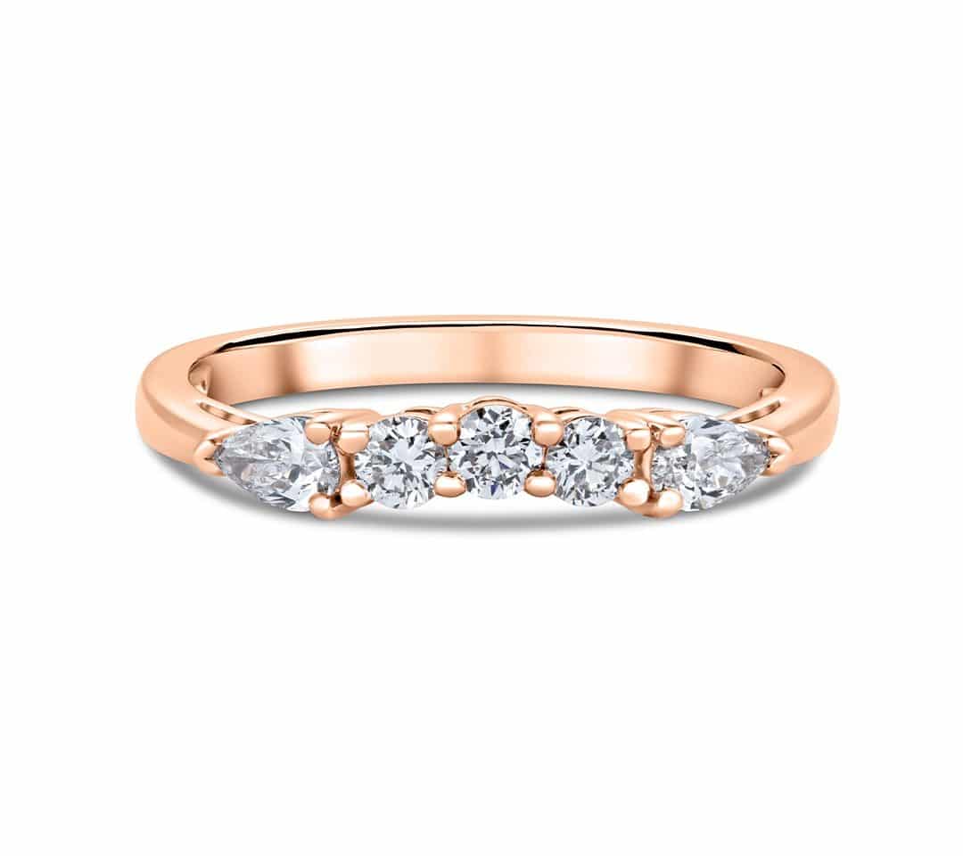 14ct Rose Gold Fitted Wedding Band, expertly crafted. This ring is set with 3 = 0.15ct RBC G/SI Diamonds and 2 = 0.16ct Pear Cut G/SI Diamonds.