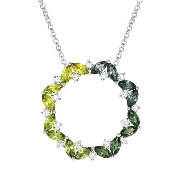 18ct White Gold Pendant featuring 16 = 2.65ct Marquise Cut Natural Australian Multi-coloured Sapphires. The Sapphires are beautifully accented by 16 = 0.14ct F/VS Round Brilliant Cut Diamonds.